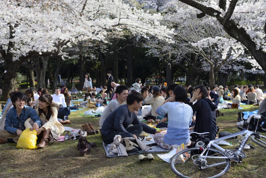 Tokyo, Japan – March 31, 2014: Visitors enjoy their picnic under the cherry blossoms at Yoyogi Park.