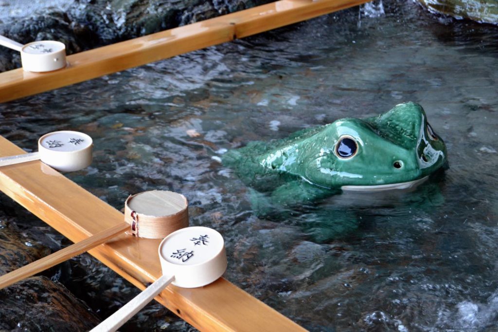 Menurut legenda setempat, katak kuil memiliki kekuatan untuk mengabulkan permintaan Anda. Obsesi dengan croaker ini berasal dari fakta bahwa kata dalam bahasa Jepang untuk katak, kaeru, adalah homonim untuk kata pengembalian barang kepada pemiliknya. Tuangkan air ke kepala binatang suci ini untuk mengembalikan barang-barang yang hilang kepada Anda.