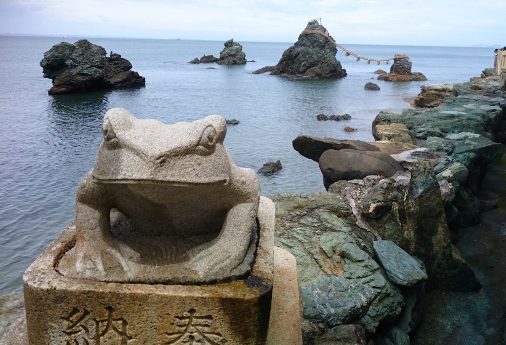 Untungnya, ada tempat yang menggabungkan semua pesona prefektur yang sepi di satu area. Tur jalan kaki di sepanjang garis pantai bertabur pantai di kota Ise akan membawa Anda ke landmark romantis yang terkenal— formasi batu Meoto Iwa, lengkap dengan kuil katak yang unik.