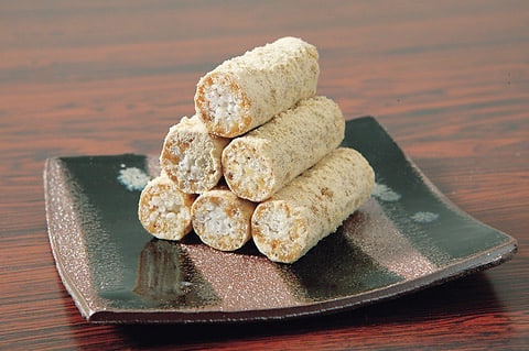 Gulungan kue beras manis dilapisi bubuk kedelai panggang untuk memuaskan gigi manis Anda. Kenikmatan pedesaan ini adalah suvenir Kumagaya yang populer.