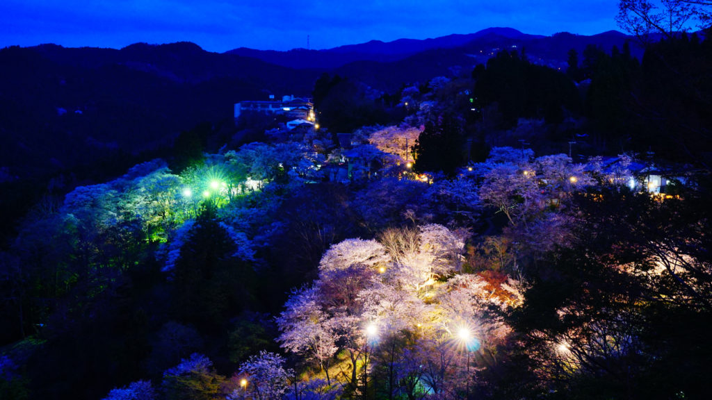 Kami Senbom (area atas) adalah tempat pengambilan gambar Gunung Yoshino yang paling umum, seperti yang terlihat di bawah, biasanya diambil. Tempat terbaik untuk mendapatkan jepretan ikonik ini adalah dari tempat bernama Hanayagura. Namun, fotografi bukan satu-satunya daya tarik karena piknik dapat dinikmati di banyak taman di area tersebut dan sekadar berjalan-jalan di medan alami dapat mengarah ke tempat yang indah dan terpencil.