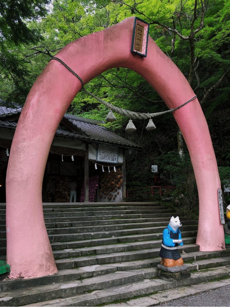 Menjulang di depan kuil adalah keanehan yang tidak ditemukan di tempat lain di dunia—gerbang torii raksasa berbentuk buah persik. Lewati gerbang dan tinggalkan satu atau dua koin di telapak tangan anjing yang terulur sebelum memberikan penghormatan di kuil. Orang biasanya mengunjungi Kuil Momotaro untuk berdoa bagi perlindungan dan kesejahteraan anak-anak, dan ada festival besar Momotaro yang diadakan setiap tahun pada Hari Anak (5 Mei).