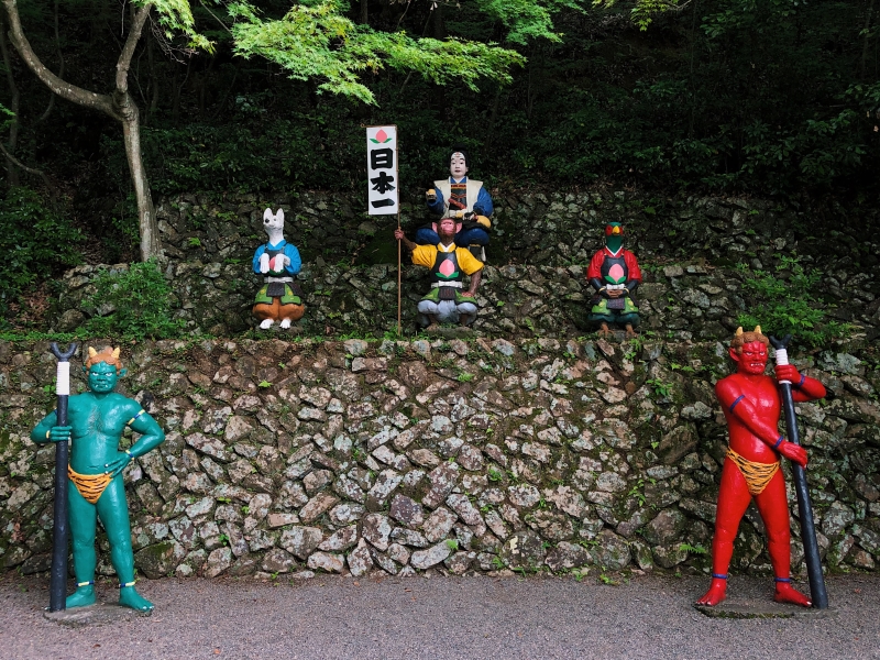Di pintu masuk berdiri patung Momotaro yang telanjang bulat dan menyembur keluar dari buah persik yang menjadikannya pilihan foto yang sempurna sebelum memasuki kuil. Naiki tangga batu untuk mencapai kuil utama, tempat teman (dan musuh) Momotaro yang berwarna cerah dapat terlihat di sekelilingnya.